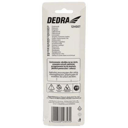 Použití: Zpracování trubek po řezání, odstraňování ostrých otřepů, příprava trubek pro montáž, zpracování trubek, rovných ploch a plechů. Pro obrábění měděných, ocelových, hliníkových, mosazných, litinových a plastových trubek. Délka výrobku 130 mm, délka čepele 46 mm, průměr čepele 3 mm, průměr těla 18,5 mm, hliníkové tělo, 1 čepel je součástí dodávky, černěná HSS M2.