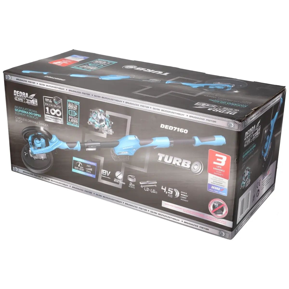 Průměr disku: Průměr kotouče: 225 mm, regulace otáček: 600-1200 min-1, nastavitelná délka zařízení: 130-160 cm, flexibilní hadice: 2 m, LED osvětlení, turbína pro odsávání prachu, navíc v balení: sáček na prach, hmotnost 4,5 kg
