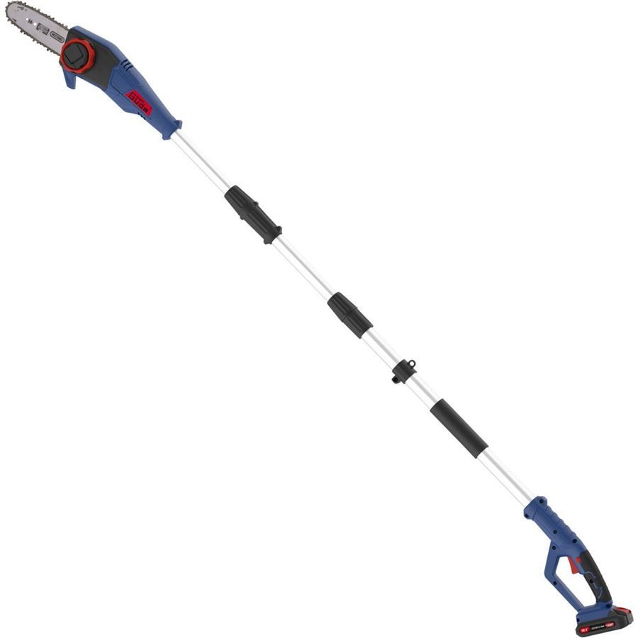 Akumulátorová vyvětvovací pila Güde, určená k prořezávání vzrostlých stromů ze země.