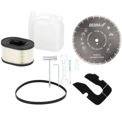 Výkon motoru: 4,8kW; Zdvihový objem motoru: 94cm3 Maximální hloubka řezu: 145mm; Rozměry kotouče: 400x25,4 - SOUČÁSTÍ SADY; Určené použití: řezání betonu, oceli; Systém přívodu vody; Oboustranný pojistný kroužek pro upevnění kotoučů s otvory 25,4mm a 20mm