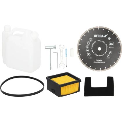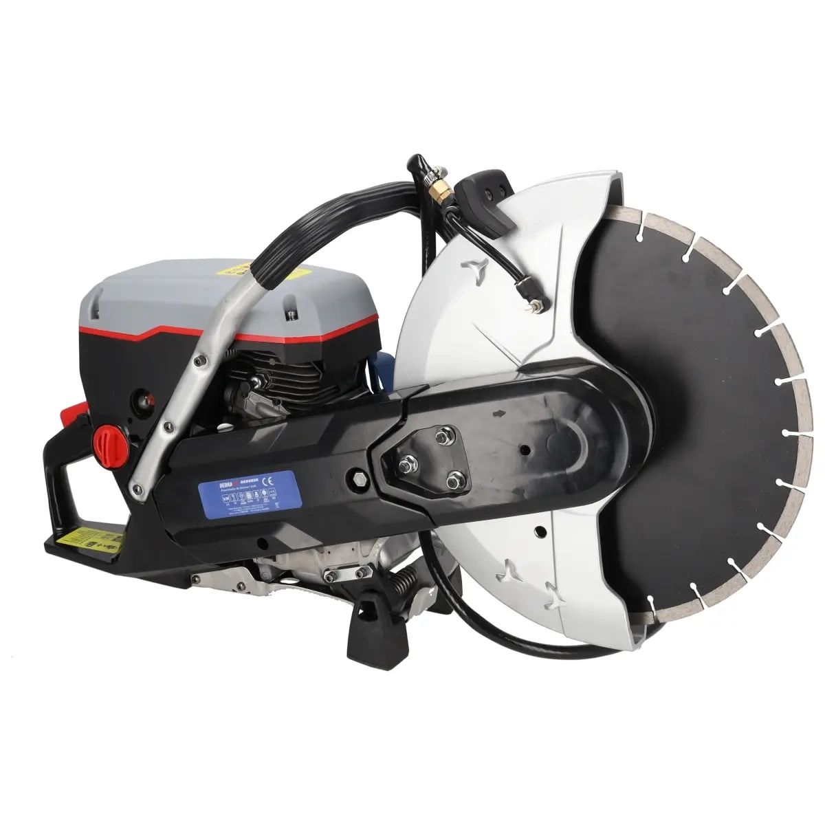 Výkon motoru: 3,5kW; Zdvihový objem motoru: 74cm3 Maximální hloubka řezu: 123mm; Rozměry kotouče: 350x25,4 - SOUČÁSTÍ SADY; Určené použití: řezání betonu, oceli; Systém přívodu vody; Oboustranný pojistný kroužek pro upevnění kotoučů s otvory 25,4mm a 20mm
