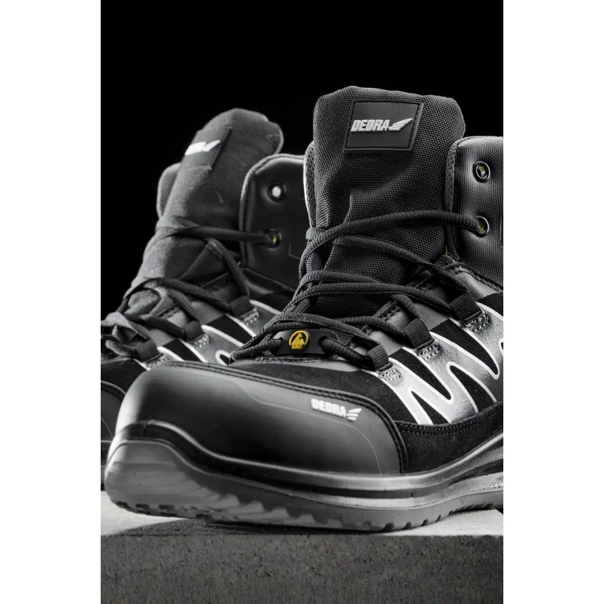 svršek: hovězinová semišová kůže, kompozitová špička, pohodlná tvarovaná komfortní stélka, podrážka: PU/PU polyuretan s dvojí hustotou, antielektrostatické vlastnosti, systém tlumení nárazů, protiskluzová podrážka.
