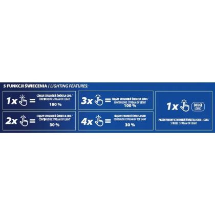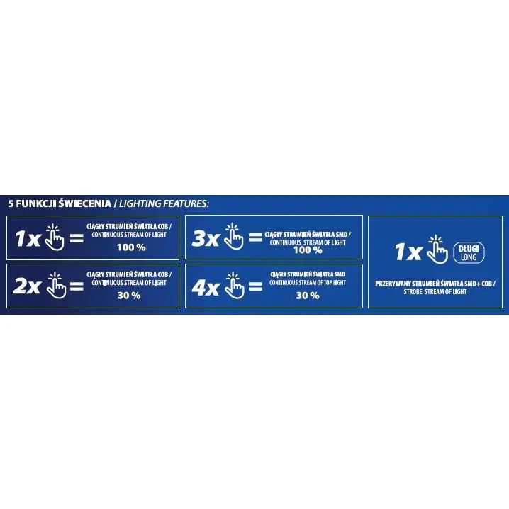 COB bar max. 300lm (funkce 100%/30%), SMD spot max. 105lm (funkce 100%/30%), pracovní dosah 20m, senzor pohybu, IP22, baterie 3.7V 800mAh, doba vybíjení 2-3h, doba nabíjení 4h, nabíjení přes USB-C, kabel součástí balení