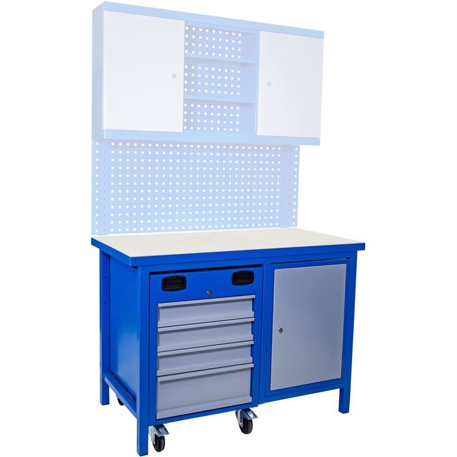 Pracovní stůl s pojízdným kontejnerem, určený k použití v domácích i servisních dílnách, výrobních provozech apod.