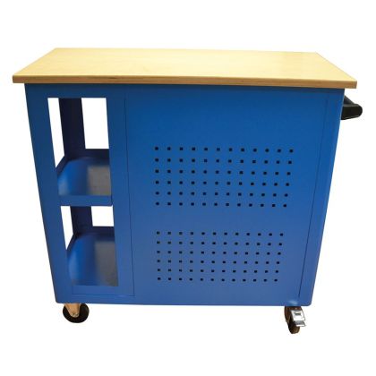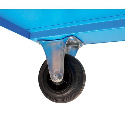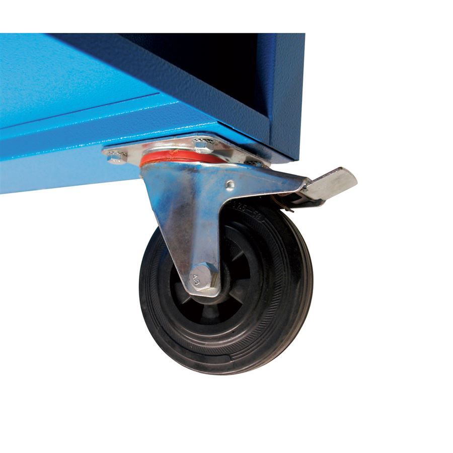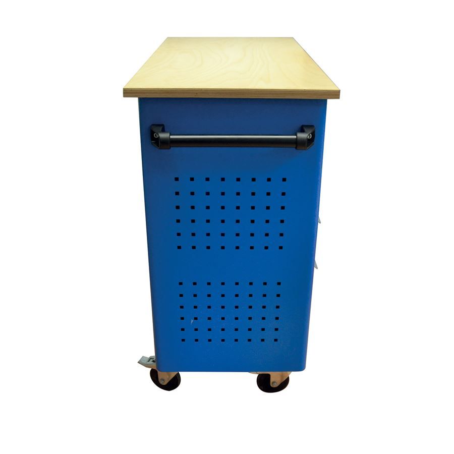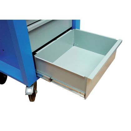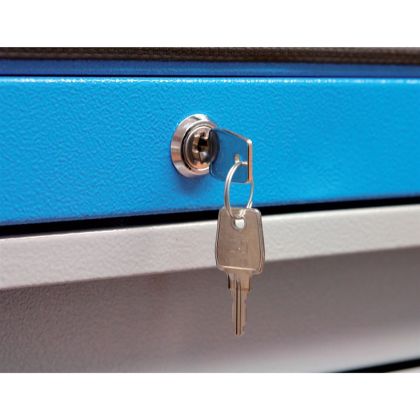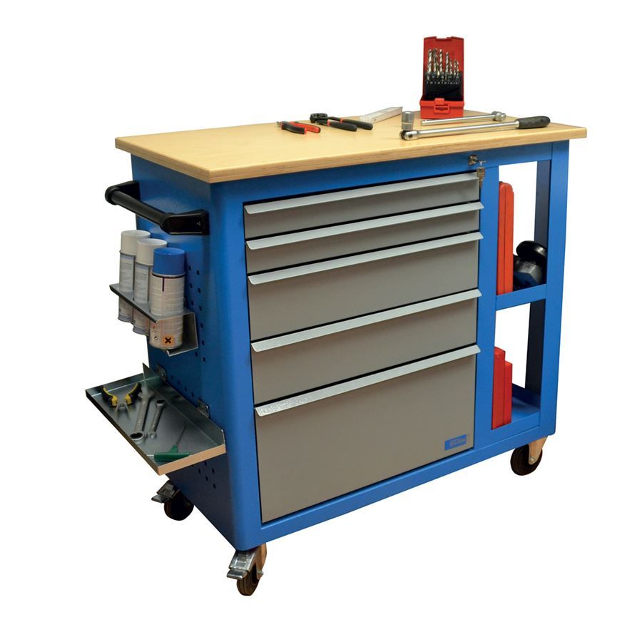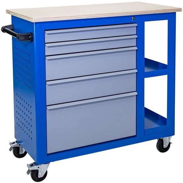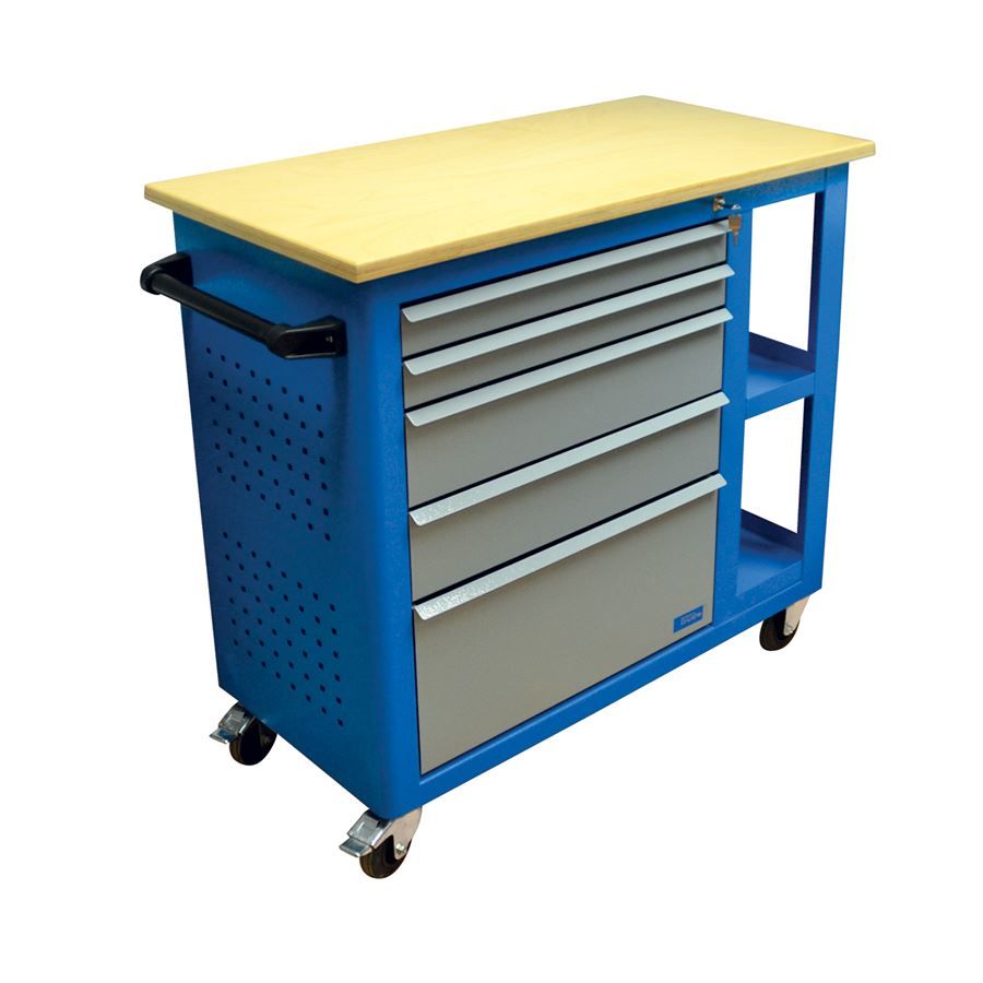 Vybavení: 5 zásuvek (-> 2 x výška 55 mm/2 x výška 125 mm/1 x výška 270 mm, centrální uzamykání cylindrickým zámkem, 2 klíče); děrované stěny pro upevnění závěsných držáků nářadí (-> otvory 10 mm2); boční odkládací plocha s poličkou (-> rozměry d x š x v: 447 x 240 x 765 mm); 4 celogumová kolečka (-> průměr: 100 mm, 2 pevná/2 vodicí/1 brzda); transportní madlo.