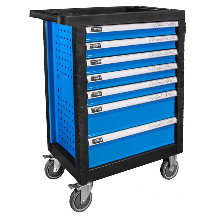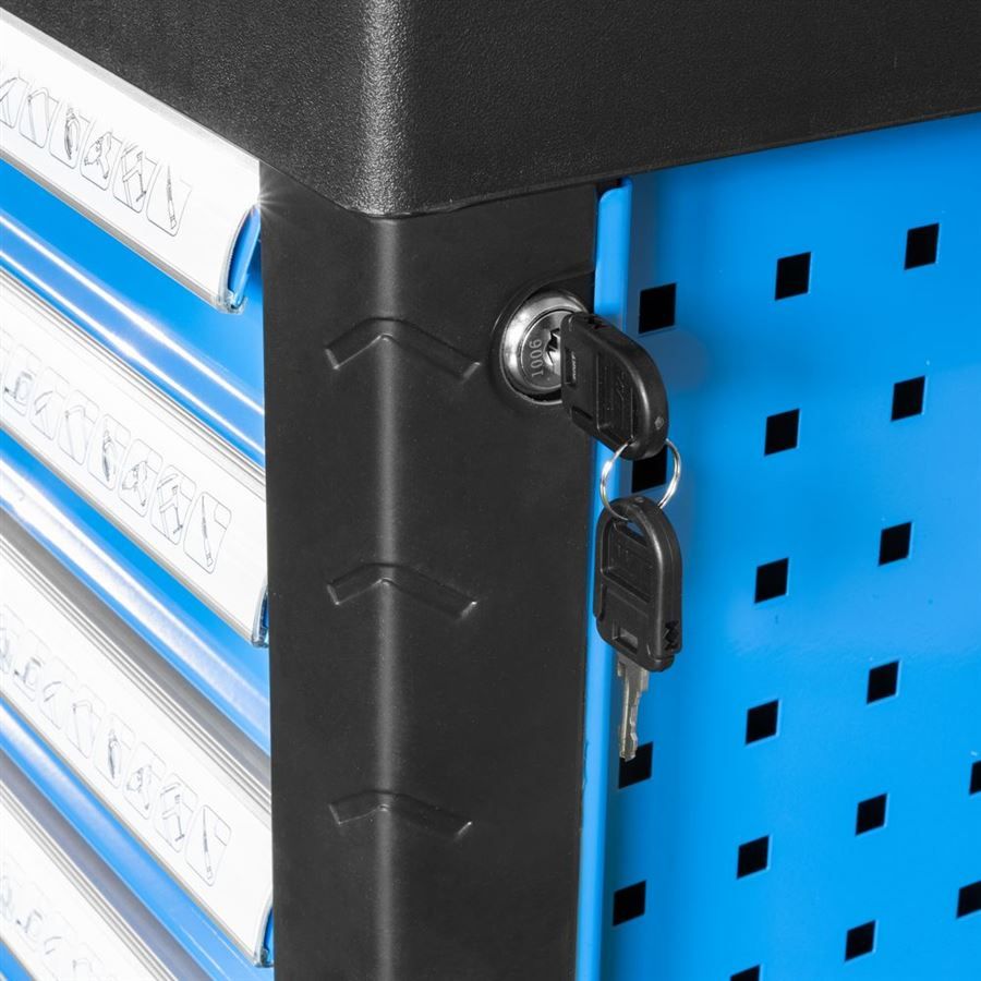 7 zásuvek na nářadí (rozměry d x š: 530 x 400 mm, výška: 2 x 140 mm, 5 x 60 mm; vybavení: teleskopické vodicí lišty, bezpečnostní pojistky proti neúmyslnému vysunutí, vnitřní štěrbinové dělení k rozčlenění prostoru děliči, centrální uzamykání cylindrickým zámkem).