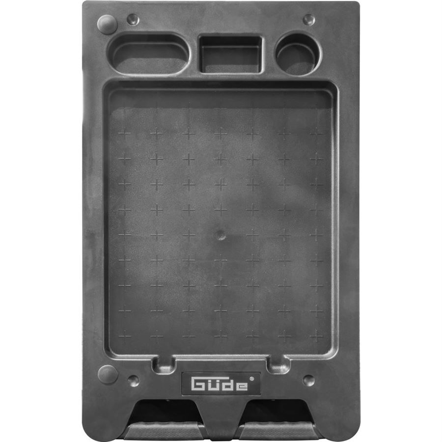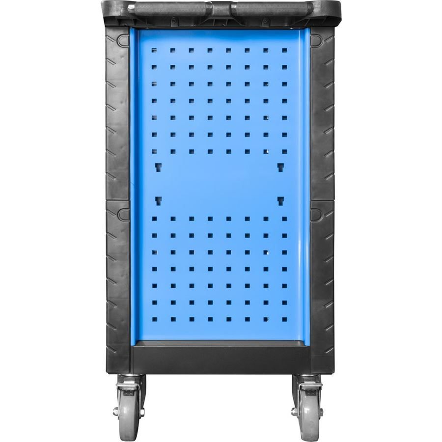 Vrchní odkládací/pracovní plocha z tvrzeného plastu (se zvýšenými okraji/praktickými přihrádkami); děrované boční stěny pro upevnění závěsných držáků (Q-systém; otvory 1 cm2); svislé hrany vozíku vč. ochranných lišt proti náhodnému poškození např. laku nebo karoserie automobilu; ergonomicky tvarovaná transportní madla, 4 celogumová kolečka (průměr: 125 mm, 2 pevná/2 vodicí s brzdou).