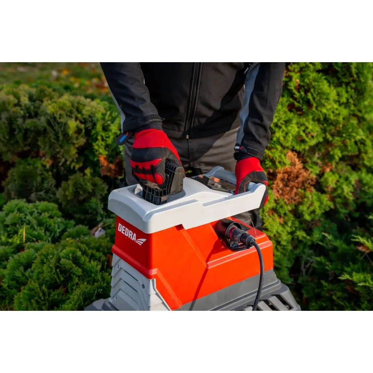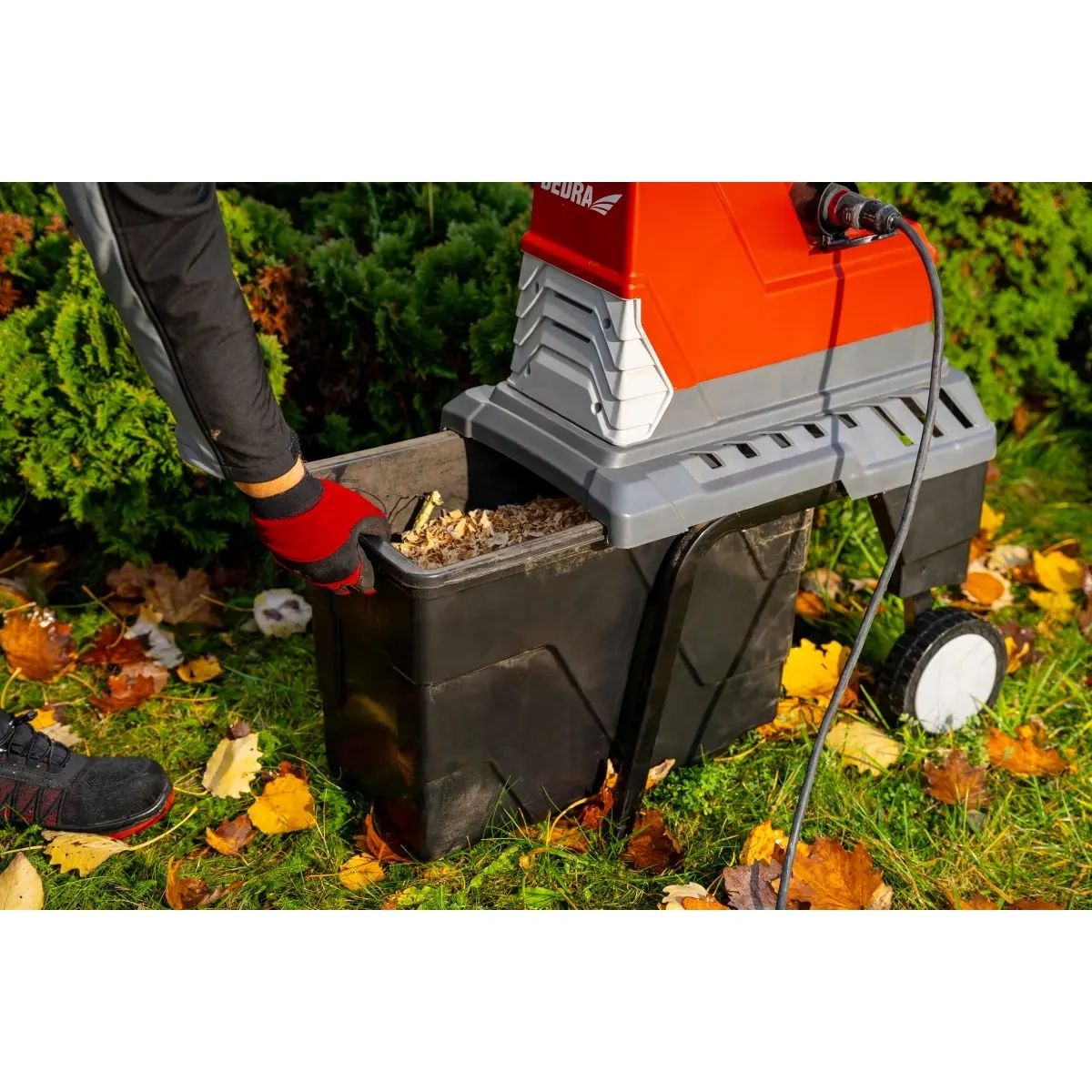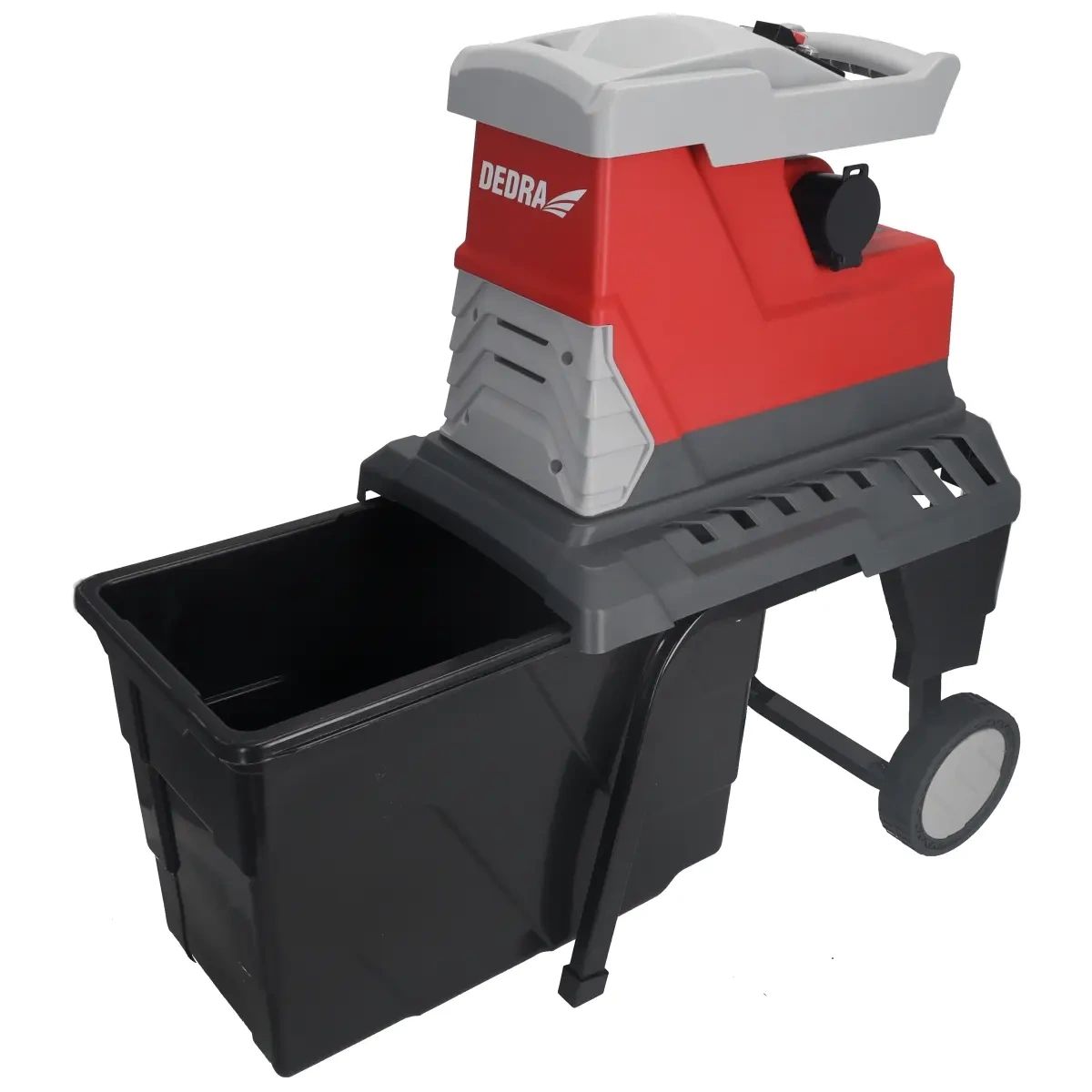 příkon 2800W, napětí 230V~50Hz, max. průměr řezu 45mm, 55l řezná nádoba, tichý chod, automatický sběr větví, zpětný chod, drticí mechanismus - zubový mlýn, ochrana proti přetížení, transportní kolečka.