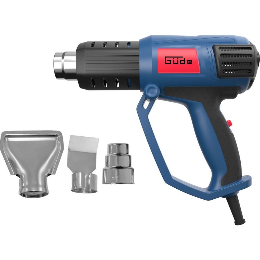Praktická horkovzdušná pistole GÜDE s mnohostranným využitím v podmínkách domácích dílen např. odstraňování starých nátěrů, nálepek, dekorací, uvolňování zarezlých šroubů, tvarování plastů, vysoušení tmelů, rozmrazování zámků, vodovodního vedení apod.