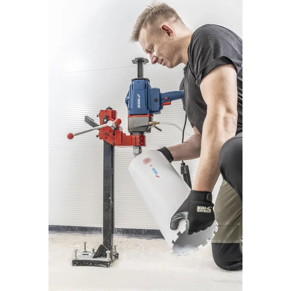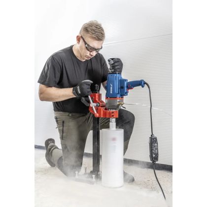 Max. průměr otvoru 205 mm, sklíčidlo 1¼\", zdvih zařízení 470 mm, plynulá regulace otáček, pozvolný rozběh, chlazení vodou, spínač PRCD, stativ součástí dodávky.