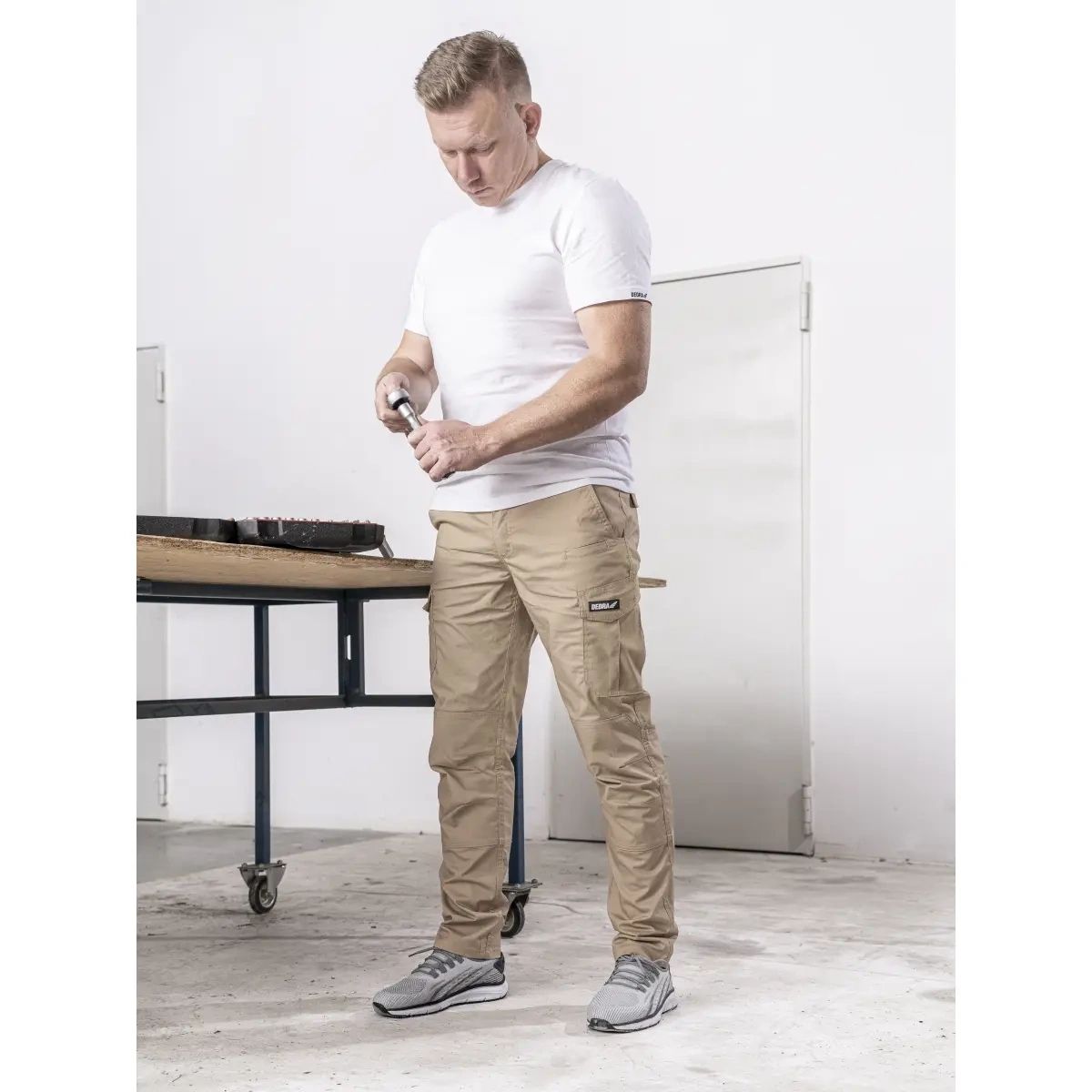 hlavní materiál: Materiál: 63% polyester, 35% bavlna, 2% SPANDEX, ušito z odolné rip-stop tkaniny, která poskytuje pevnou vazbu i pohodlí, hmotnost 220 g/m², přídavný spandex pro ještě větší pohodlí, slimfit střih, zesílení kolen - dvojitá vrstva tkaniny, dvě velké otevřené kapsy, dvě vícečetné kapsy na bocích, dvě zadní kapsy s přídavnými klopami na suchý zip, regulace pasu pomocí všitých gumiček na obou stranách pasu, sedm poutek na pásek, z toho šest standardní šířky (1.5 cm) a jedno široké poutko vzadu (4,5 až 6,5 cm), kroužek na klíče, nastavitelný spodní lem (kalhoty lze zkrátit přibližně o 2 cm).