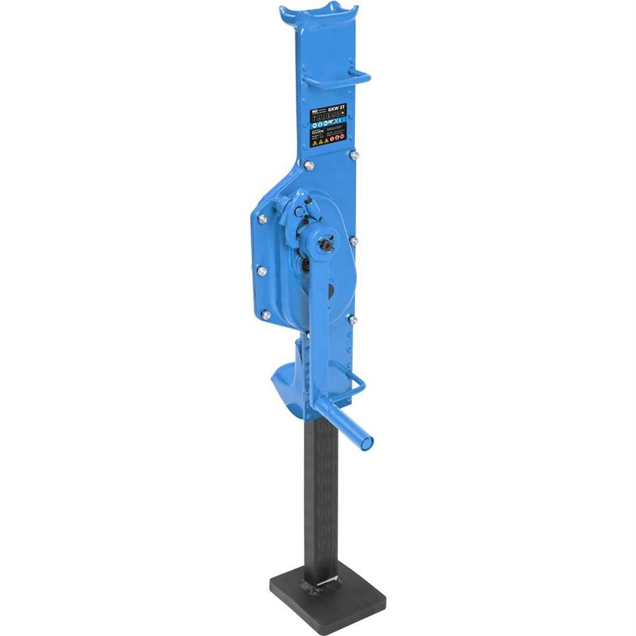 Konstrukce: robustní ocelová skříň s (nosnou) vidlicí, ozubená tyč na stojné desce 170 x 140 mm, sklopná ruční klika, rukojeť pro pohodlné přenášení.