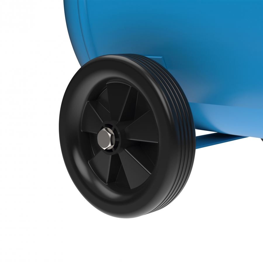 Tlaková nádoba: 50 l, vypouštěcí ventil kondenzátu, opěrky s gumovými patkami (2), transportní rukojeť, celoplastová kola pro snadné přejíždění.