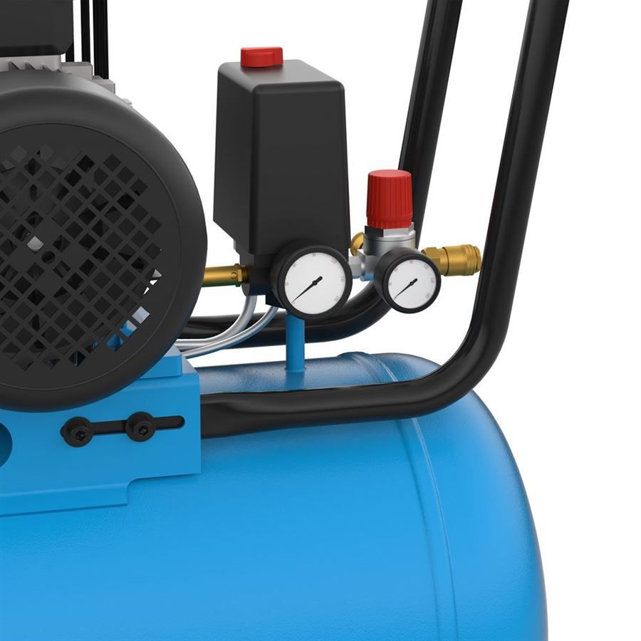 Vybavení: 2 manometry, 2 výstupy stlačeného vzduchu, tlakový spínač, redukční ventil, pojistný přetlakový ventil, zpětný ventil, vzduchový filtr, dochlazovač, olejoznak, jistič motoru, ochranný (mřížový) kryt řemenu.