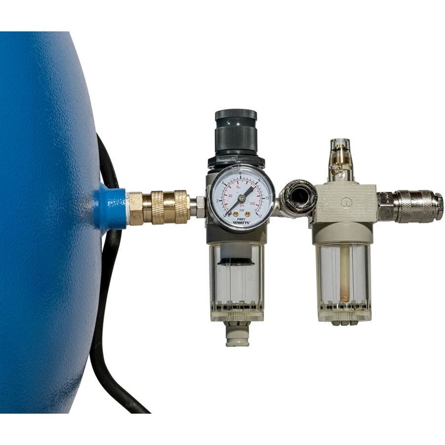 • 3 výstupy vzduchu (-> u redukčního ventilu/na úpravné jednotce: rychlospojky; na vzdušníku: kulový kohout s vnitřním závitem 1/2'')