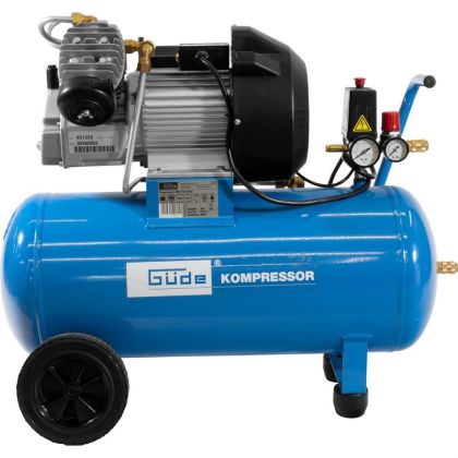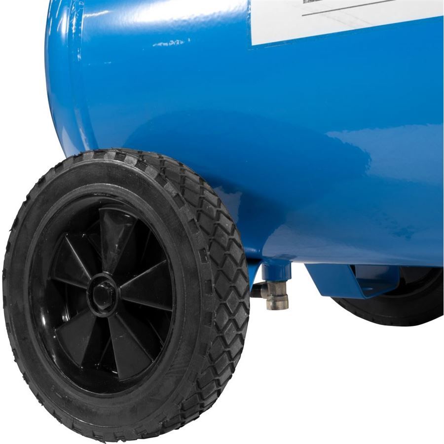 Tlaková nádoba: 50 l, ventil pro vypouštění kondenzátu, přední podpěra nádoby s gumovými patkami, plastová kola s gumovým běhounem/transportní madlo pro jednoduchou manipulaci.