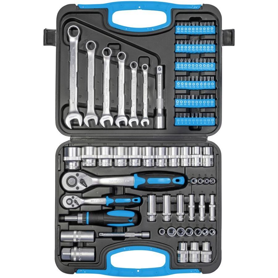 Tato sada nářadí v praktickém kufříku se skládá ze 104 dílů. Obsahuje 2 ráčny (1/2" a 1/4" se 72 zuby) s vhodnými krátkými a dlouhými hlavicemi a odpovídajícími prodlouženími. Tuto sadu doplňuje velký sortiment bitů, nástrčných hlavic, šroubovák s ráčnovou funkcí, stejně jako všechny potřebné adaptéry a 6 očkoplochých klíčů.