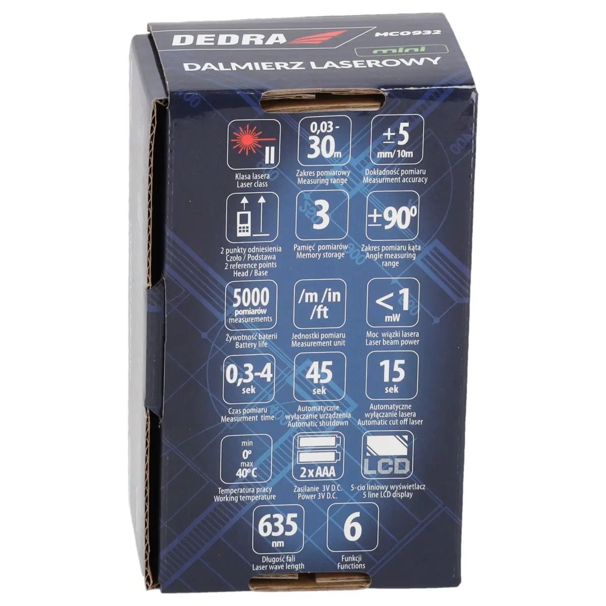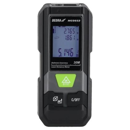 Rozsah měření 0,03-30 m, přesnost měření: ±5 mm, vlnová délka laseru: 635 nm, výkon laseru: < 1 mW, třída laseru: II, funkce měření objemu, funkce měření povrchu, funkce trigonometrického výpočtu, napájení 1,5 V 2*AA, včetně: kufříku, šňůrky, návodu k použití, 2*AA baterií