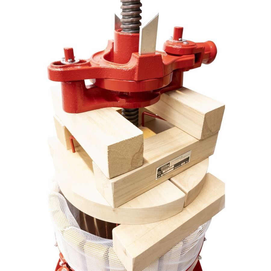Ruční lis GÜDE, určený k domácí výrobě moštů nebo ovocných šťáv.