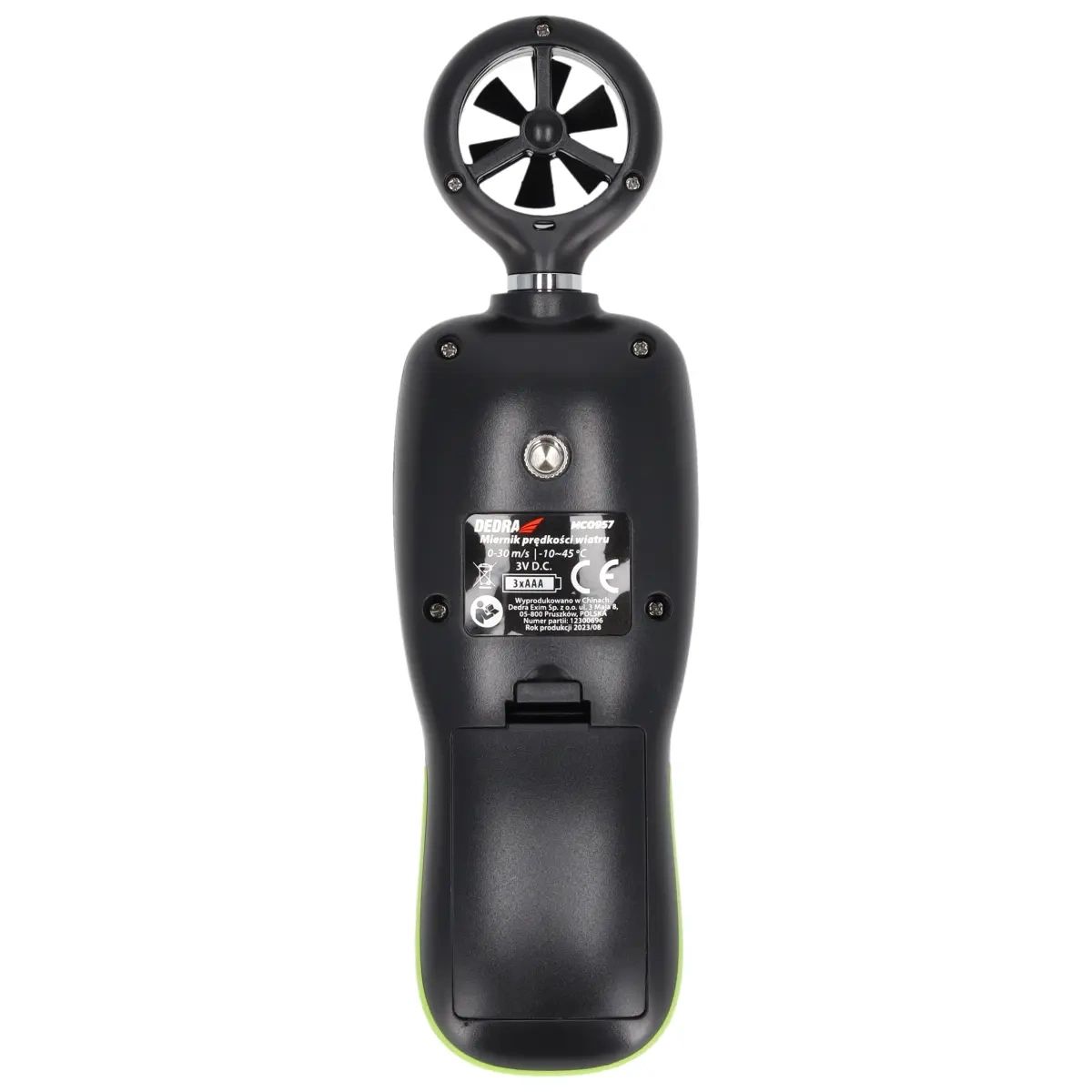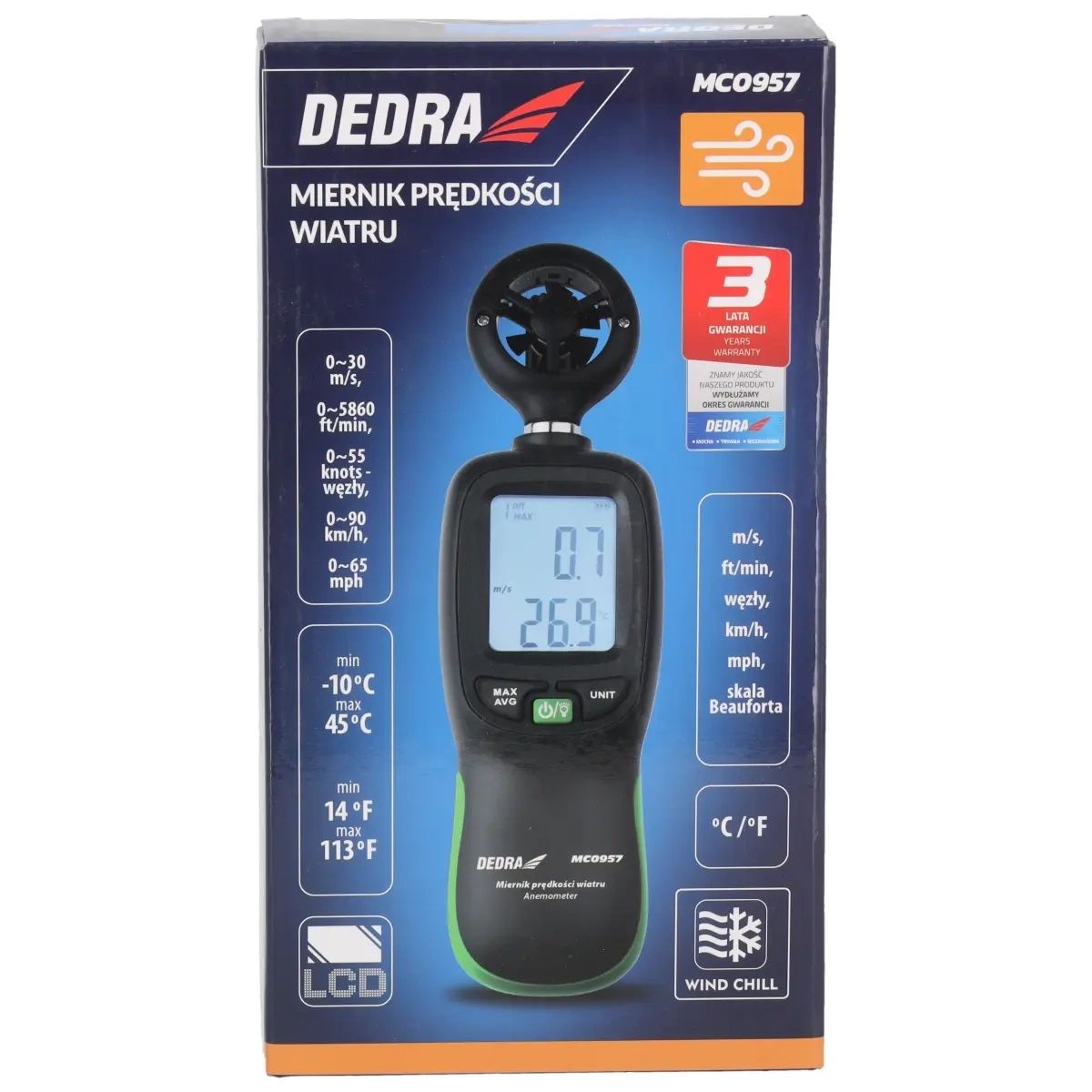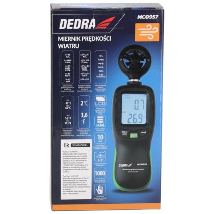 Rozsah měření teploty: Jednotky měření: m/s, ft/min, uzly, km/h, mph, Beaufortova stupnice, přesnost měření teploty: -10 ~ 45 / 14~113 ˚C: ±Rozsah měření rychlosti vzduchu: 0 ~ 30 m/s, 0 ~ 5860 ft/min, 0 ~ 55 uzlů - uzlů, 0 ~ 90 km/h, 0 ~ 65 mph , přesnost měření rychlosti vzduchu: ±5 % ±0,1 m/s, ±5 % ±20 ft/min, ±5 % ±0,2 uzlů - knots, ±5 % ±0,4 km/h, ±5 % ±0,2 mph , podsvícený displej LCD, napájení: 3xAAA, 1/4\" zásuvka pro stativ,