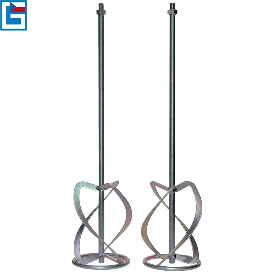 Konstrukce: obouruční rámová rukojeť s měkkou tlumicí vložkou, 2 spirálové míchací metly (-> pro jemnozrnné/hrubozrnné stavební hmoty; průměr koše: 140 mm).