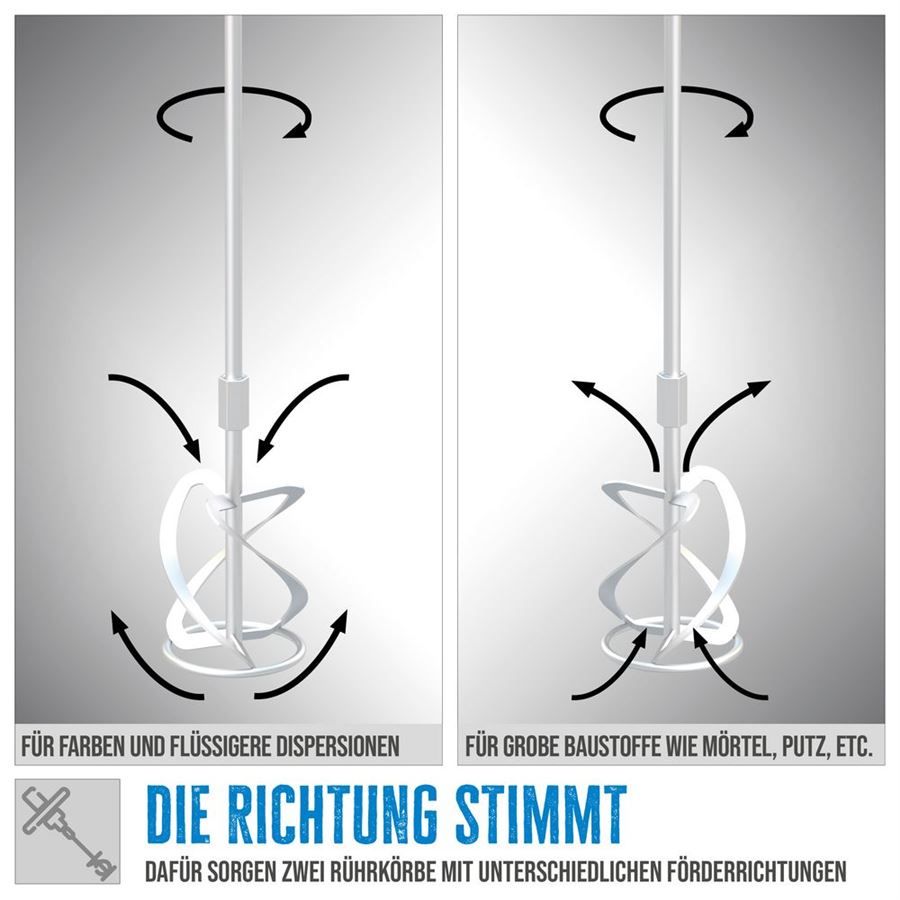 Míchací metla s pravotočivou spirálou, vhodná pro mísení hutných (mazlavých) stavebních hmot • míchadlo s levotočivým (míchacím) košem, využitelné především k namíchání řidších směsí.