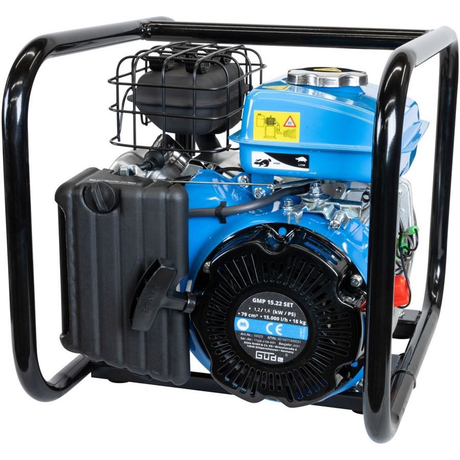Praktická souprava benzinového čerpadla Güde, určeného k čerpání čisté (mírně znečištěné) užitkové vody, se sací a výtlačnou hadicí.