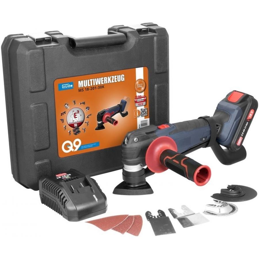 Vybavení: Li-Ion akumulátor 18 V/2,0 Ah; nabíječka 3,0 A/h; 3 pilové listy (ponorný, segmentový, diamantový); delta brusná deska 93 mm; sada brusných papírů K60 - K320, 18dílná; škrabka; plastový transportní kufřík.