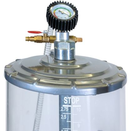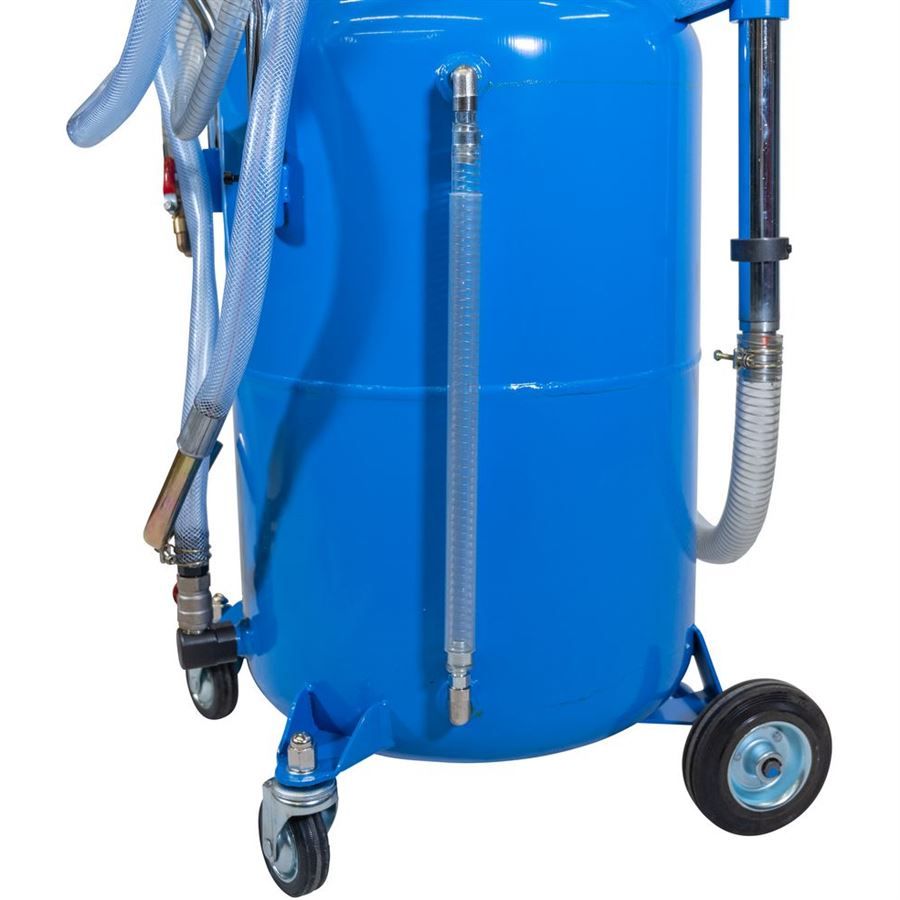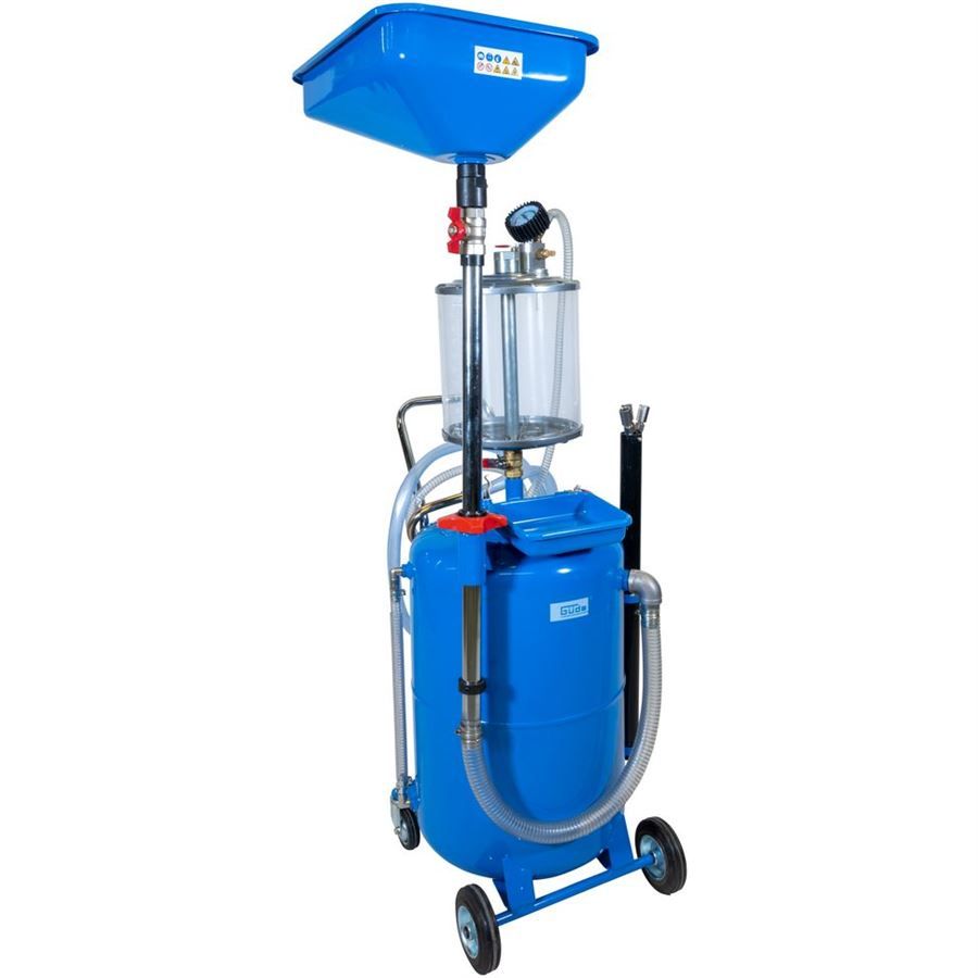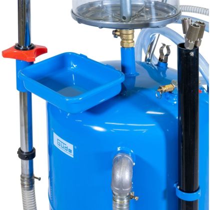 Konstrukce: sběrná miska, generátor podtlaku, manometr, 1,4 m odsávací hadice, plastový odměrný válec, zásobník na olej, pojezdová kola.