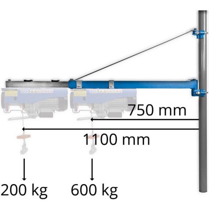 Výkyvné ocelové rameno s maximální nosností 600 kg, koncipované pro bezpečné zavěšení elektrických lanových zvedáků (→ kompatibilní s modely GSZ 100/200, GSZ 200/400, GSZ 300/600).