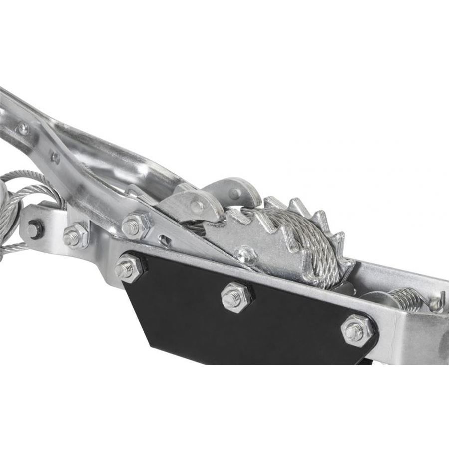 Konstrukce: pozinkovaný ocelový rám, lanová kladka, ruční páka s gumovou rukojetí.