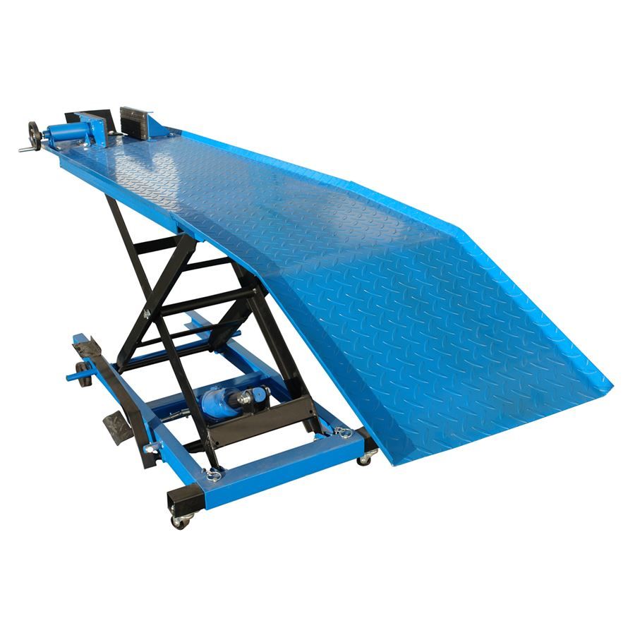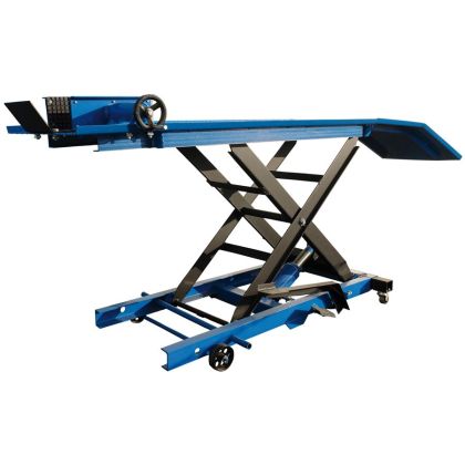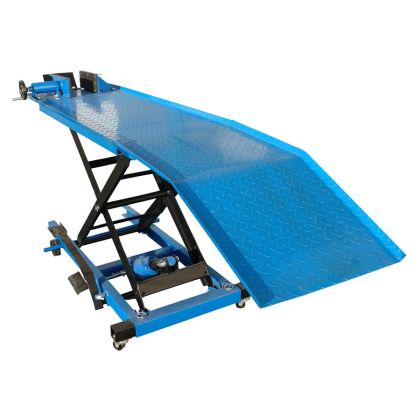 Hydraulická zvedací plošina, určená ke zdvihání motocyklů v prostředí garáží, domácích/servisních dílen apod. (-> maximální nosnost: 360 kg).
