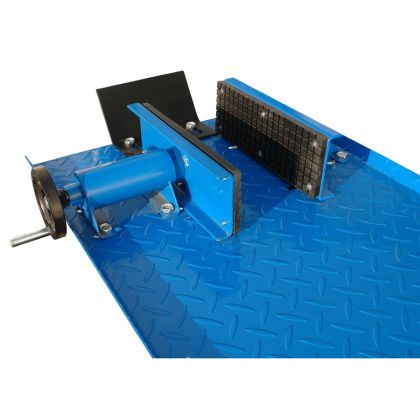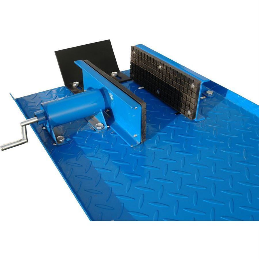 Pohodlné zvedání/plynulé spouštění plošiny pomocí pedálů (2), bezpečná fixace předního kola motocyklu prostřednictvím pohyblivé upínací svorky (-> max. průměr kola: 135 mm), mechanická aretace ve 3 různých úrovních zdvihu (-> 445/610/730 mm).