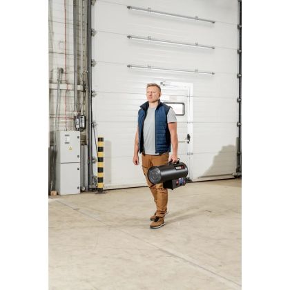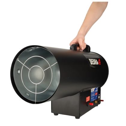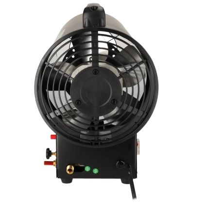 průtok vzduchu: 900-1000 m³/h, kovové pouzdro, provozní napětí: 230V/50 Hz, piezoelektrické zapalování tlačítkem, palivo: propan-butan G30, spotřeba paliva: Hmotnost: 7,5 kg, vybavení: plynová hadice regulátor, přívodní tlak plynu: 1,21-3,55 kg/h: 1,5 bar, nastavitelný tepelný výkon, ochranný spínač proti přetížení IPX4