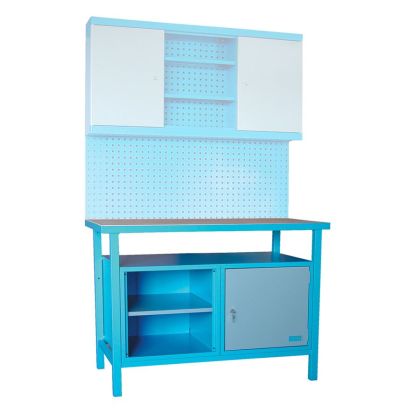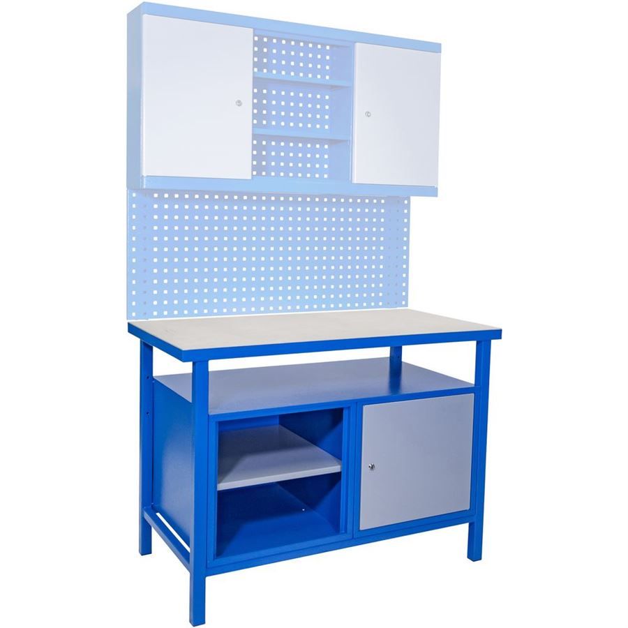 Vybavení: uzamykatelná dveřová skříňka (-> 2 vnitřní vyjímatelné police, zesílená dvířka, cylindrický zámek, 2 klíče); otevřená skříňka (-> 1 vyjímatelná police); odkládací plocha pod pracovní deskou.