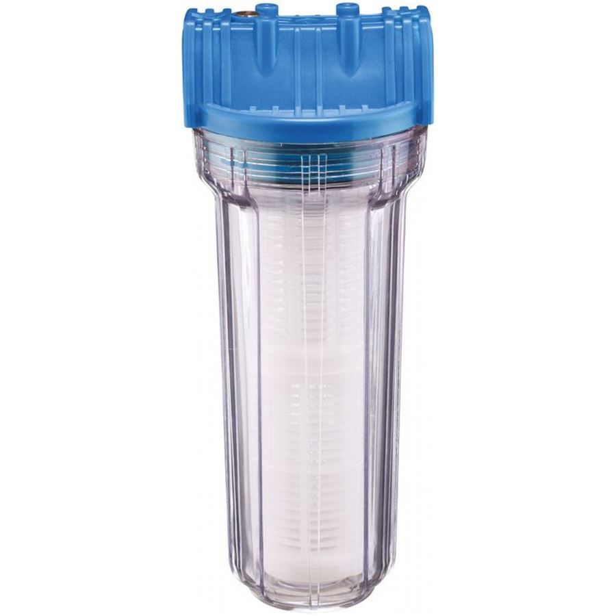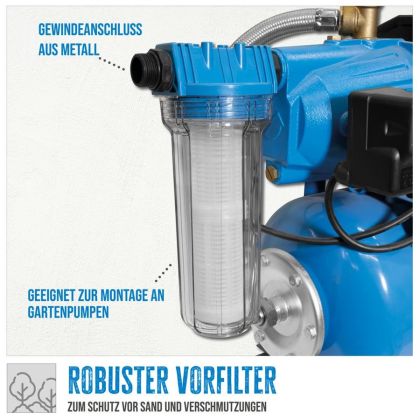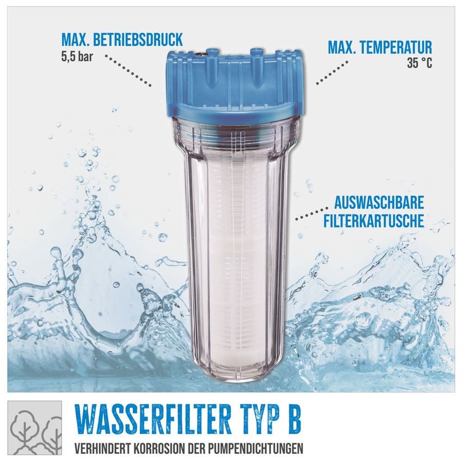 Snadná údržba i montáž (-> mezi sací hadici a domácí vodárnu). Konstrukce: průhledná nádobka z PVC, omyvatelné filtrační kartuše, včetně 2 závitových redukcí.