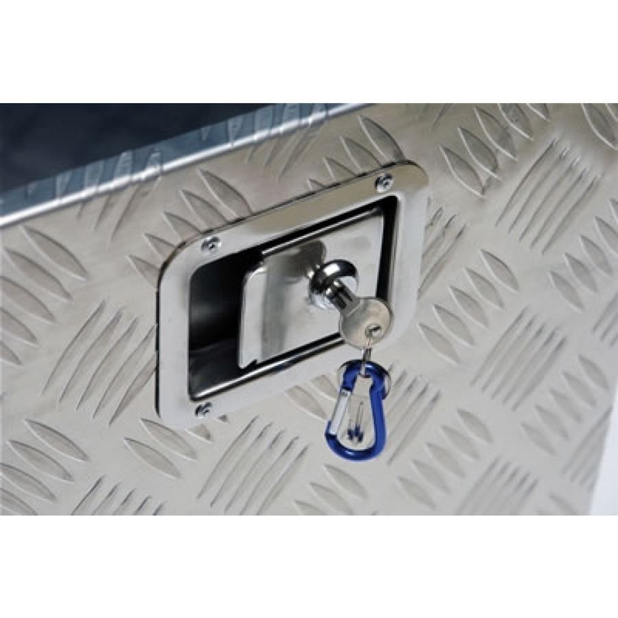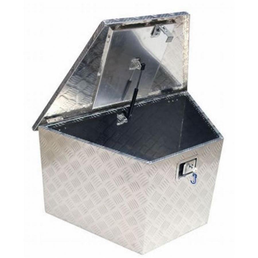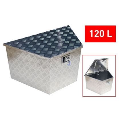 Robustní hliníková bedna, určená k montáži na oj přívěsu za účelem přepravy nářadí, strojů, pracovního materiálu apod. (-> úložný prostor: 120 l). Samočinné otevírání/přidržování otevřeného víka teleskopickou vzpěrou, uzamykání cylindrickým zámkem. Konstrukce: ručně pájený hliníkový box (-> tloušťka plechu: 1,7 mm), obvodové hrany i rohy s olemováním (-> bezpečná manipulace). Celkové rozměry (d1 - d2 x š x v): 860 - 415 x 490 x 470 mm.