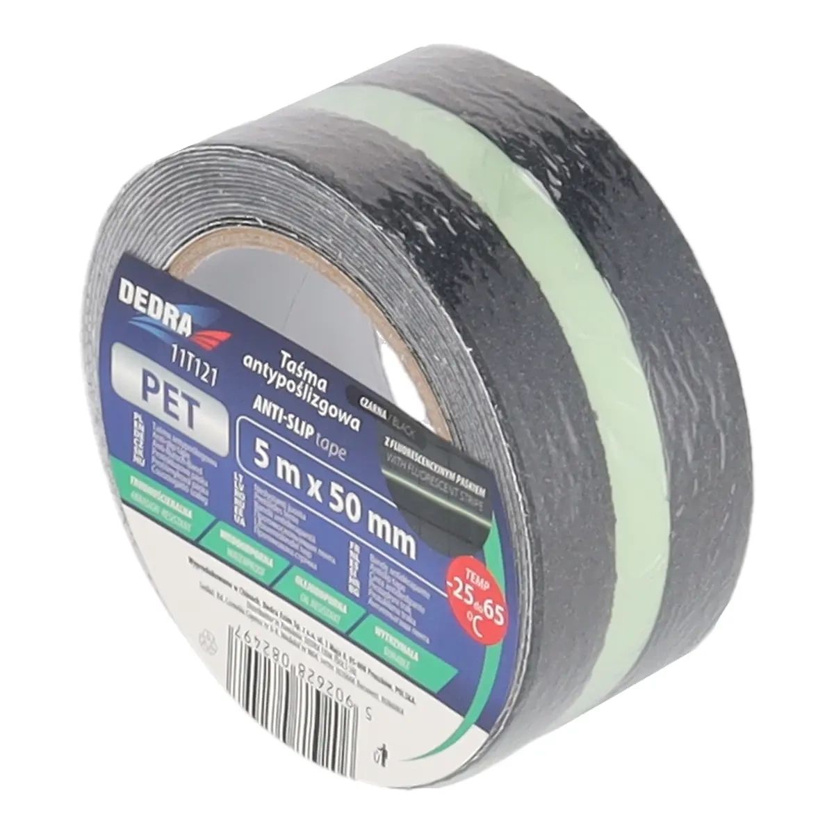 50 mmx5 m, montáž na kluzké podlahy, schody. Pro vnitřní i venkovní použití. materiál PET s odolností proti oděru, voděodolný, odolný proti olejům, odolný proti teplotám od -25 do 65 °C, tloušťka 0,13 mm.