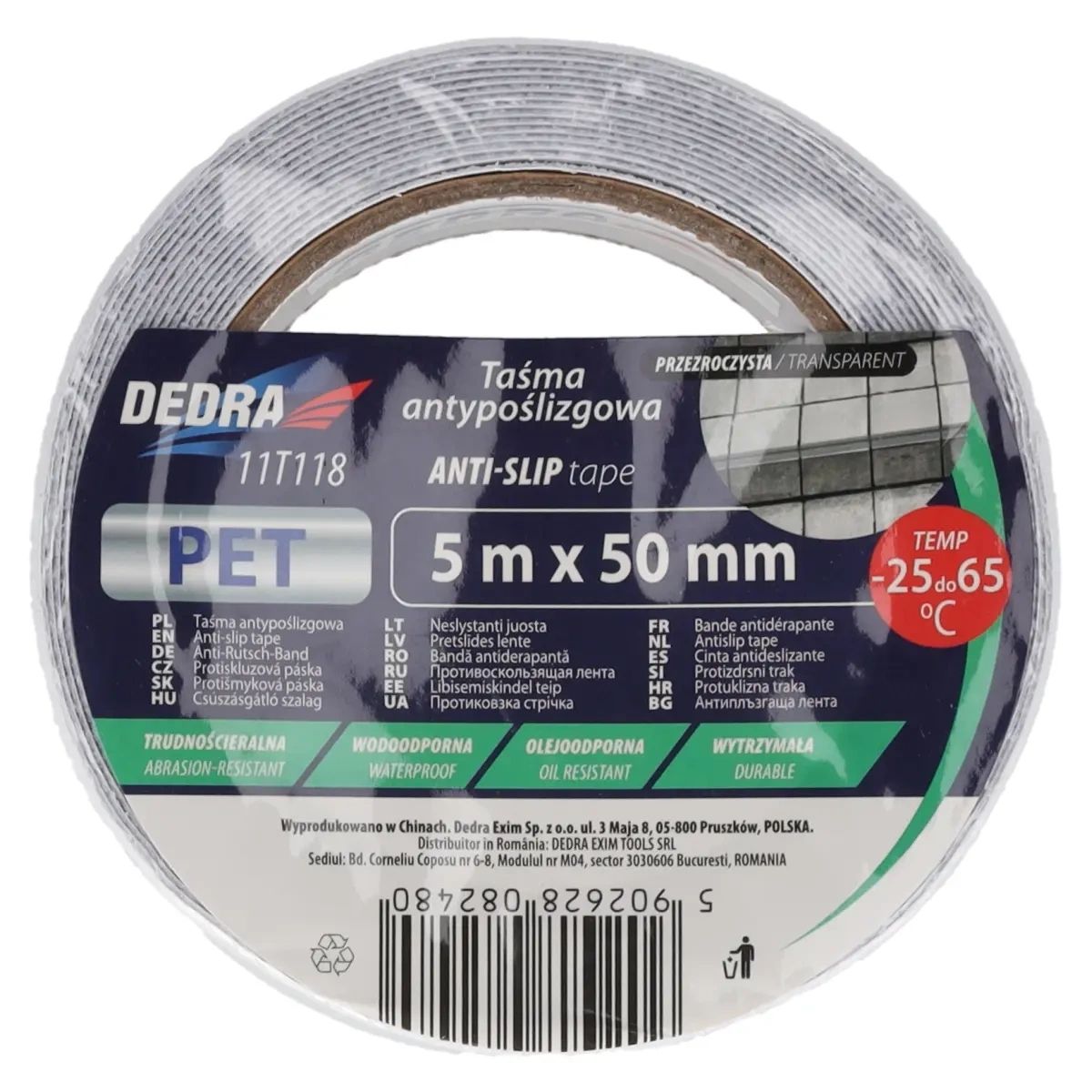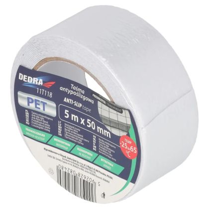 50 mmx5 m, instaluje se na kluzké podlahy, schody. Pro venkovní i vnitřní použití. materiál PET s odolností proti oděru, voděodolný, odolný proti olejům, odolný proti teplotám od -25 do 65 °C, tloušťka 0,13 mm.