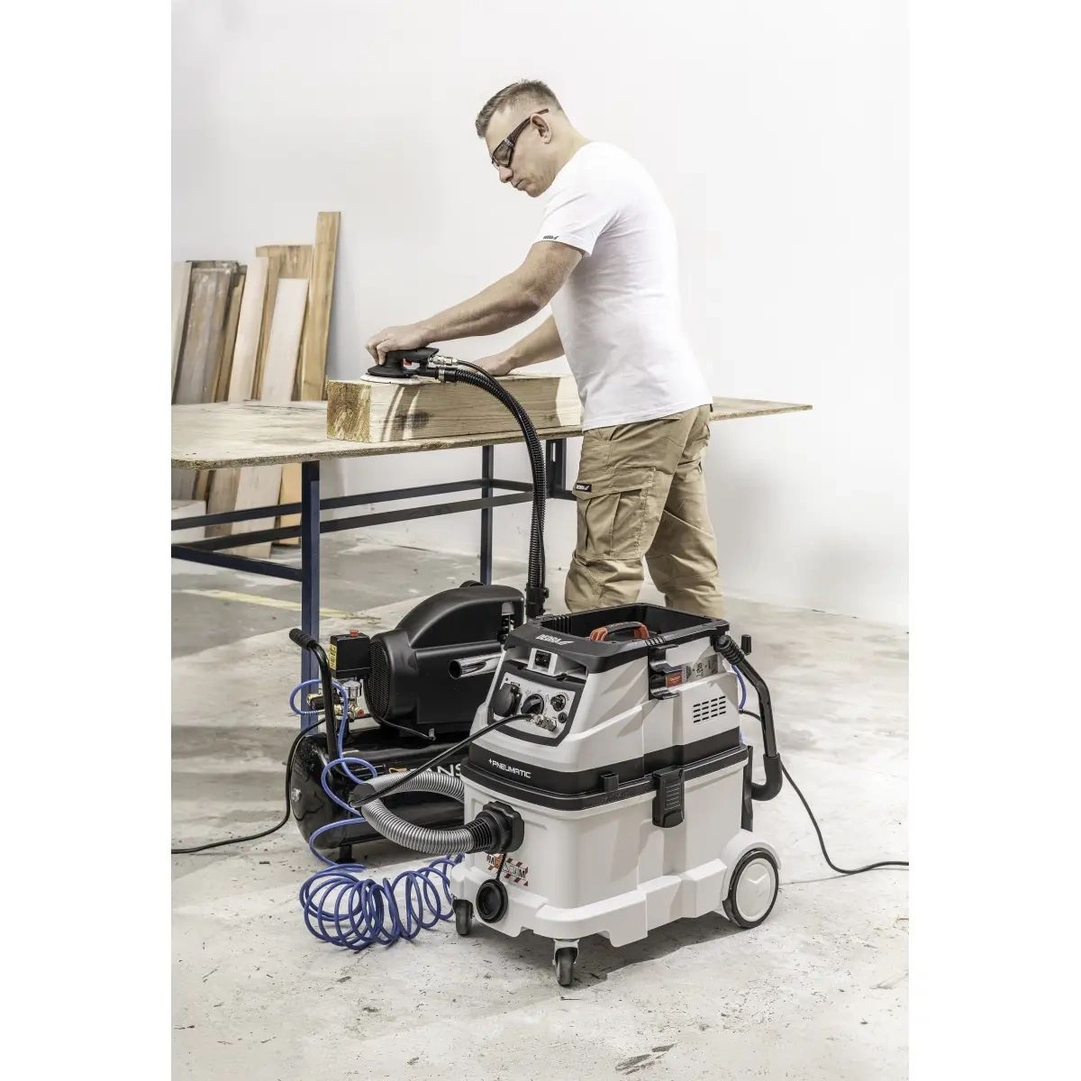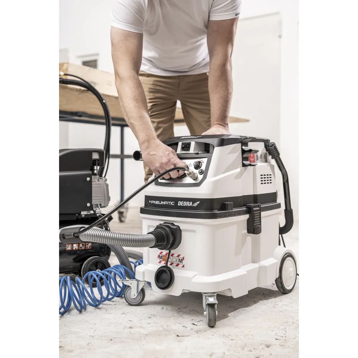 s funkcí automatického čištění filtru, třída M, pneumatické připojení, objem nádrže 40 l, zásuvka na elektrické nářadí 2000 W, součástí dodávky: hadice vzduchového spotřebiče, ohebná hadice 32 mmx2 m, teleskopická trubka 32 mm, transportní kolečka, plochý podlahový kartáč, kulatý kartáč, štěrbinový kartáč, jednorázový bavlněný sáček a látkový sáček pro opakované použití, HEPA filtr třídy M, možnost připojení kompresoru a použití vzduchového spotřebiče se synchronizací zapnutí/vypnutí, funkce automatického oklepávání prachu, vhodné pro práci s omítkou, broušení atd.,Filtrační systém třídy M, mokrý a suchý chod, sběr vody, měděné vinutí motoru, automatické vypnutí napájení při naplnění nádrže na vodu, ukazatel stavu nádrže, možnost dálkového ovládání.