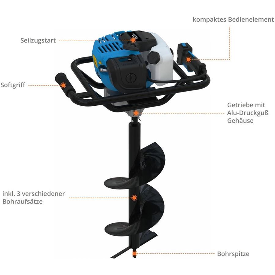 Motorový půdní vrták Güde, určený k vyvrtávání děr v lehkých nebo středně těžkých půdách.
