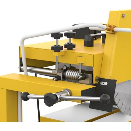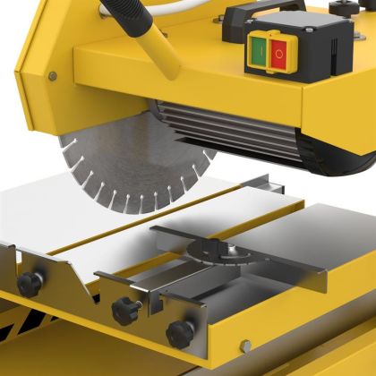 Vybavení - funkce • plynulé nastavení řezací hlavy (v rozsahu 0 - 45°), umožňující přesné řezy pod různými úhly • max. délka řezu až 800 mm • hloubka řezu při úhlu 90º 115 mm. pod úhlem 45º max. 72 mm • precizní nastavení řezu na pokos pomocí excentrického šroubu • diamantový dělící kotouč Ø 350 mm • ochrana proti stříkající vodě i přetížení • snadné přemisťování zásluhou podvozku a transportní rukojeti • prostorově úsporné skladování díky sklopným nohám |
