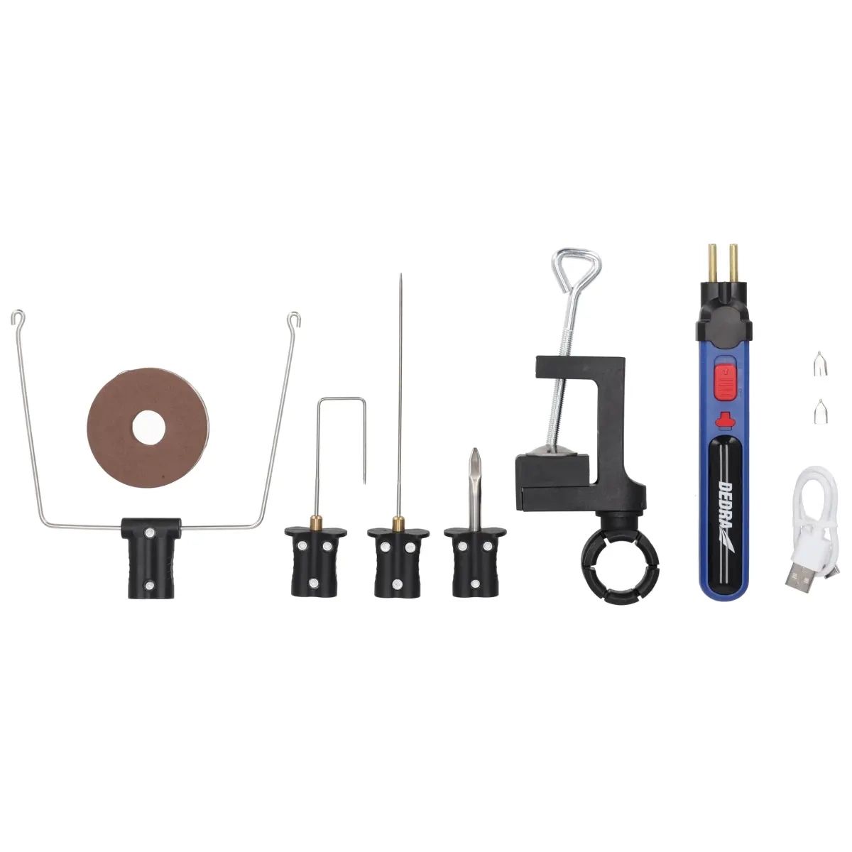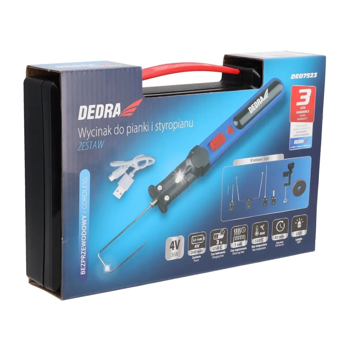 Napájení: dobíjecí, 4 V, max. pracovní teplota 550 °C, doba ohřevu: 5s, pracovní doba: 550 °C, pracovní doba: 5s, pracovní doba: 550 °C, pracovní doba: 5s, pracovní doba: 5s: 40 min, otočná rukojeť pro montáž na stůl, LED osvětlení, určení: pro řezání pěny a pěnového polystyrenu, výměnné hroty součástí balení (4 ks).