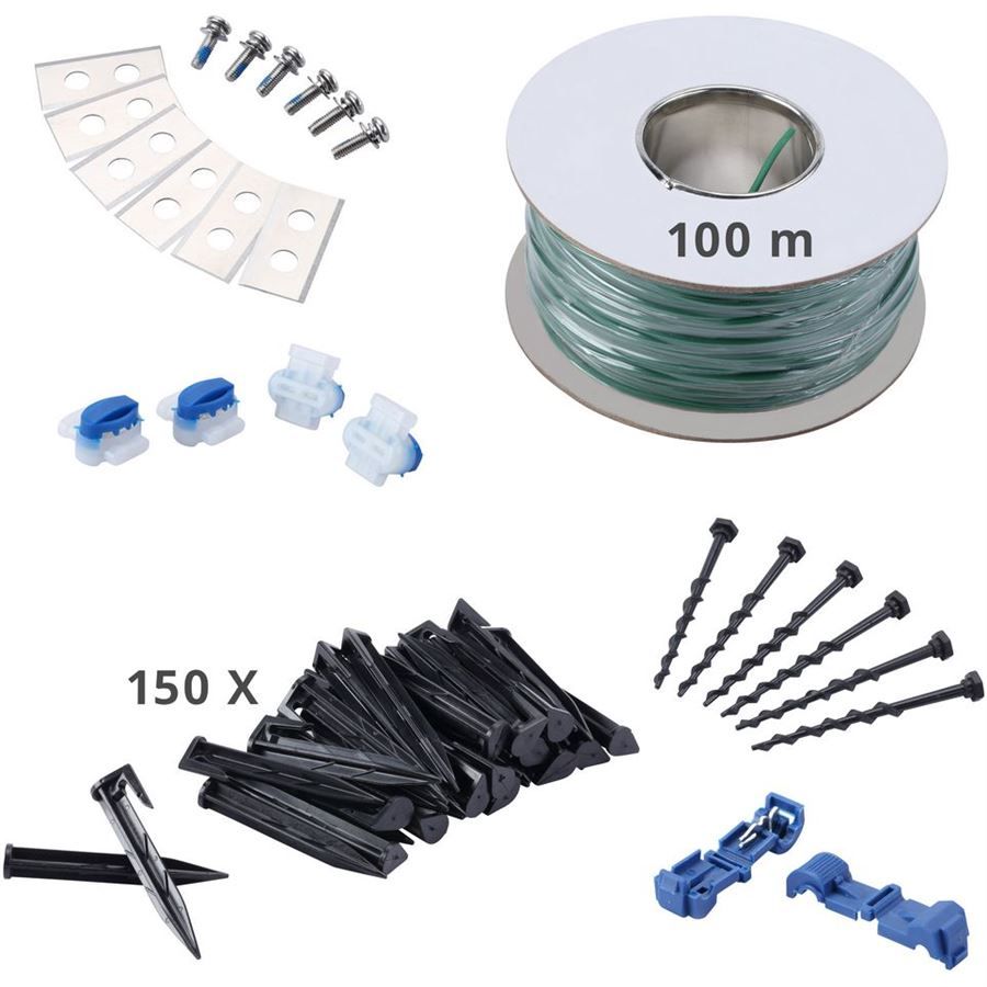 Příslušenství: nabíječka, 100m ohraničující vodič, 150 kolíků, náhradní nože atd.