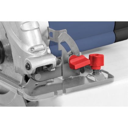 Přesné nastavení hloubky řezu (-> 0°: 0 - 55 mm/45°: 0 - 38 mm), vodicí deska s bočním naklápěním 0 - 45°, aretace hřídele pro snadnou/rychlou výměnu kotouče.