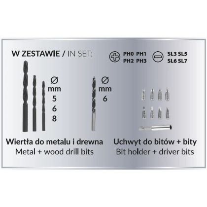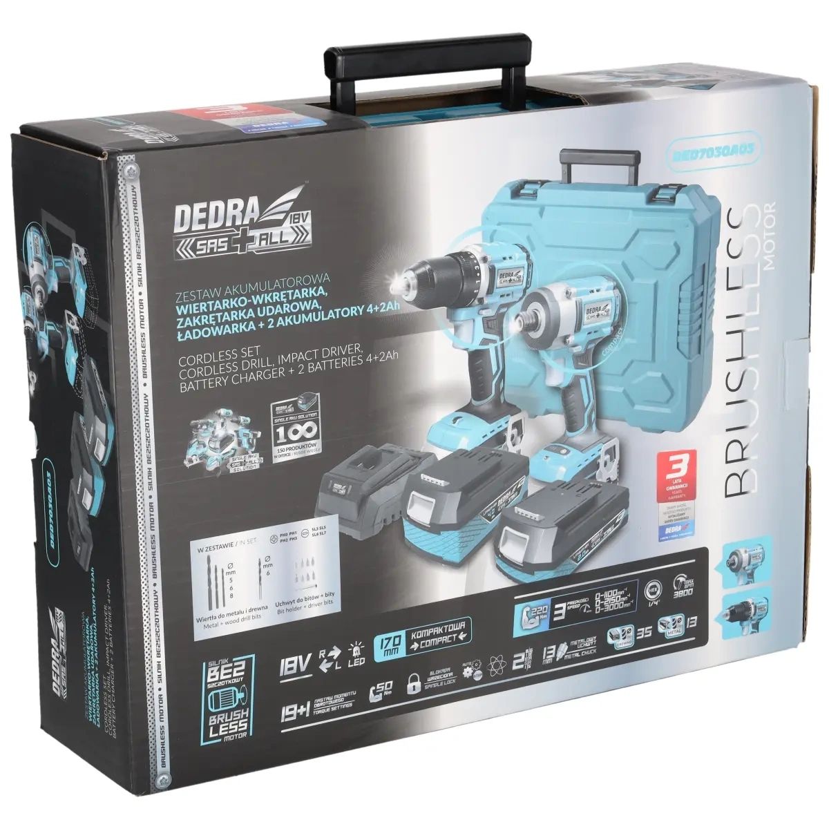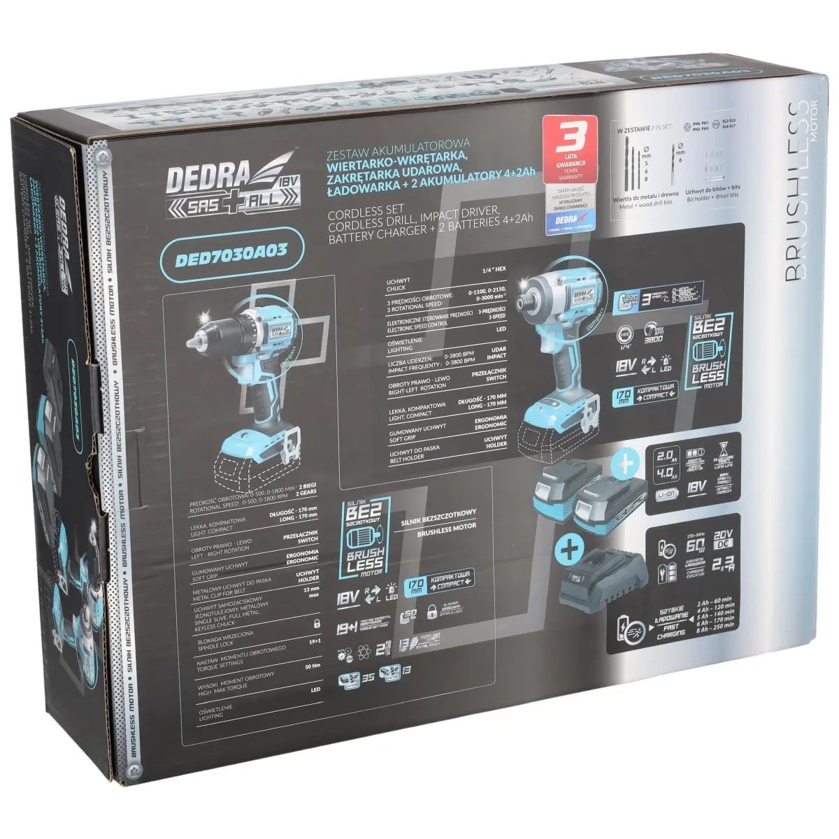 Součástí dodávky: 18V bezuhlíková kompaktní vrtačka/šroubovák DED7143, 18V bezuhlíkový příklepový šroubovák DED7144, 2,0Ah 18V Li-Ion akumulátor DED7032, 4,0Ah 18V Li-Ion akumulátor DED7034, nabíječka DED7038, kufr BMC 13ks příslušenství.