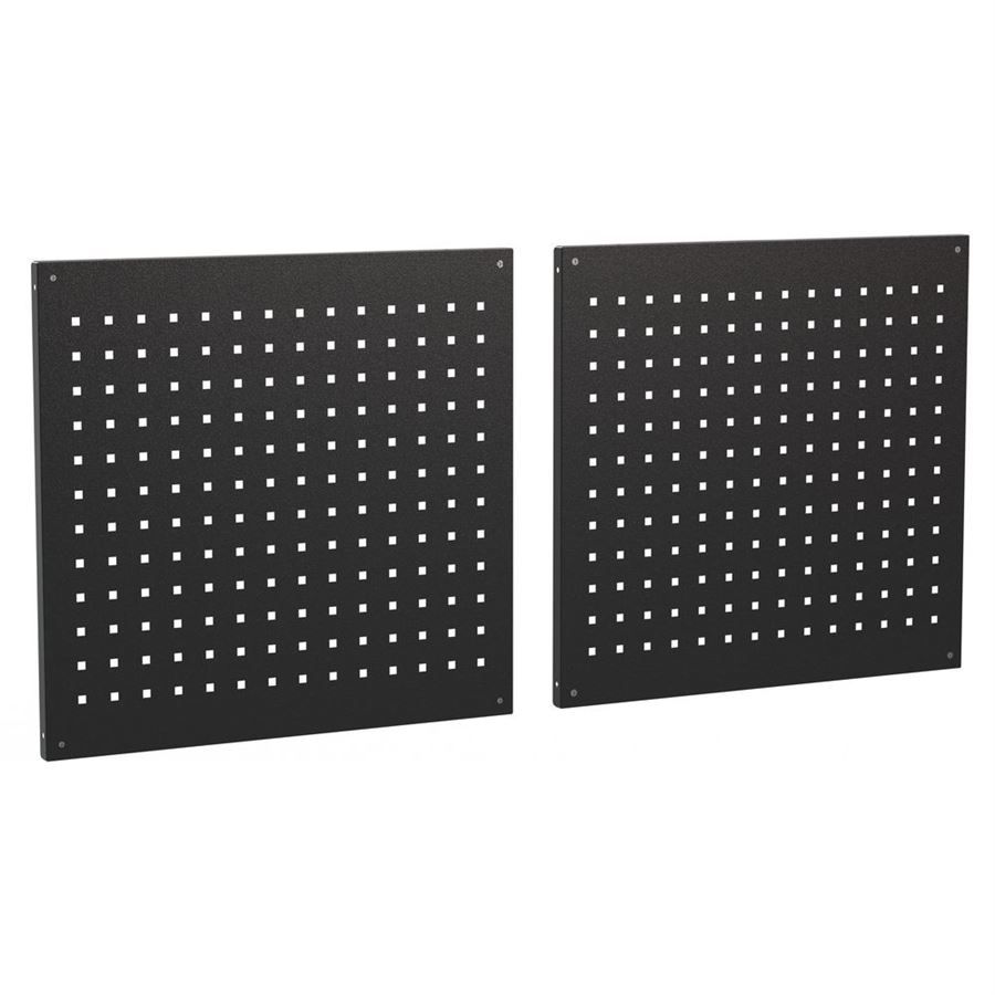 Dvoudílná děrovaná sada panelů GÜDE. Optimální využití rohu místnosti, zejména v kombinaci s odpovídající rohovou nástěnou skříňkou a rohovou deskou pro spojení dvou pracovních stolů.