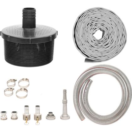 Sací hadice s vnitřní spirálovou vložkou, zamezující jejímu zúžení vlivem podtlaku • celoplastový sací koš • 7 m výtlačná hadice vč. hliníkové proudnice.