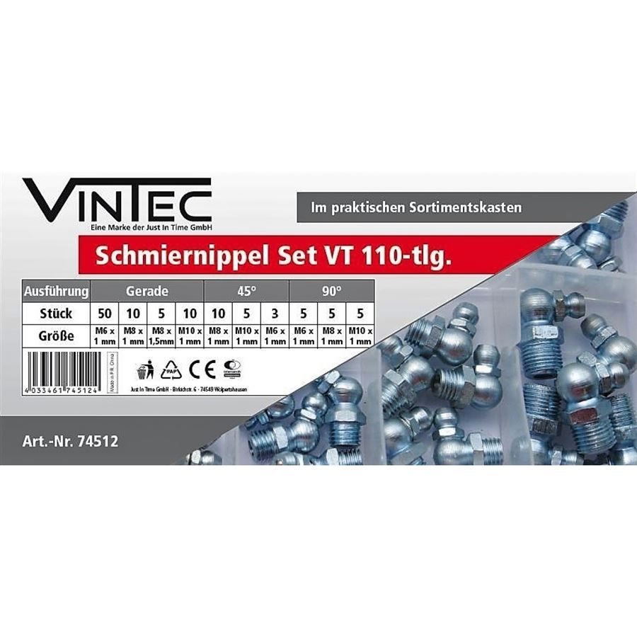 Sada obsahuje (rozměry/ ks): rovné: M6 x 1 mm / 50 ks , M8 x 1 mm / 10 ks , M8 x 1,25 mm / 5 ks , M10 x 1 mm / 10 ks 45°: M6 x 1 mm / 5 ks , M8 x 1 mm / 10 ks , M10 x 1 mm / 5 ks 90°: M6 x 1 mm / 5 ks , M8 x 1 mm / 5 ks , M10 x 1 mm / 5 ks