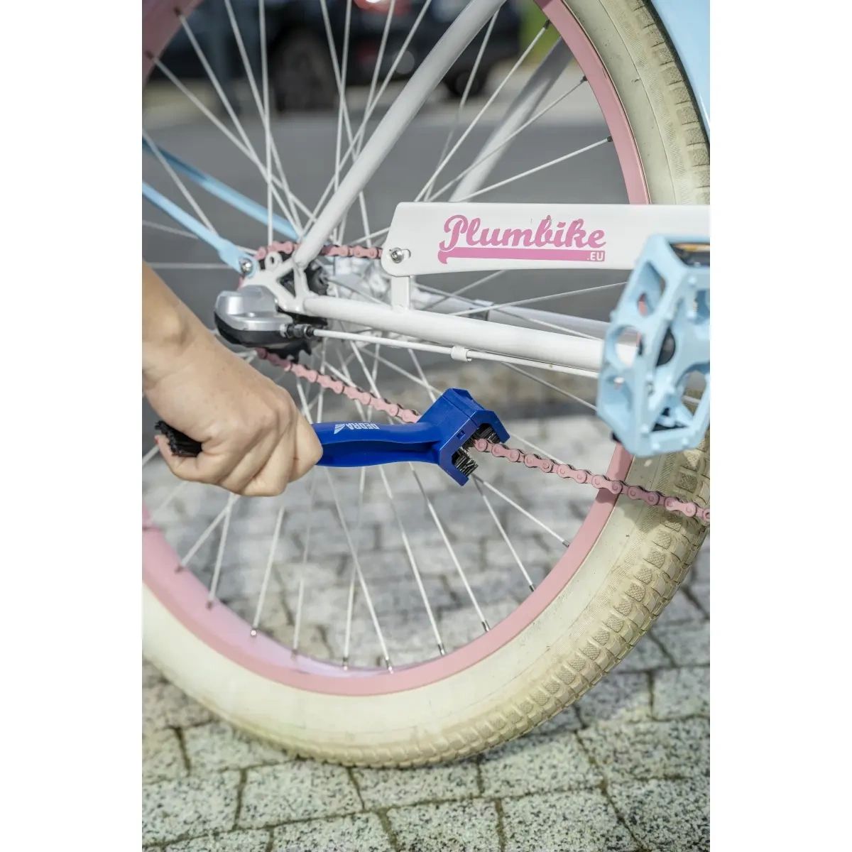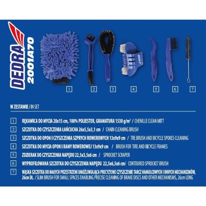 Obsahuje 7 součástí: kartáč na čištění řetězu; škrabku na čištění pohonu; tvarovaný kartáč na čištění pohonu; kartáč na čištění pneumatik a paprsků jízdního kola; úzký kartáč na čištění malých prostor; čisticí rukavici; kartáč na čištění pneumatik a rámu jízdního kola.